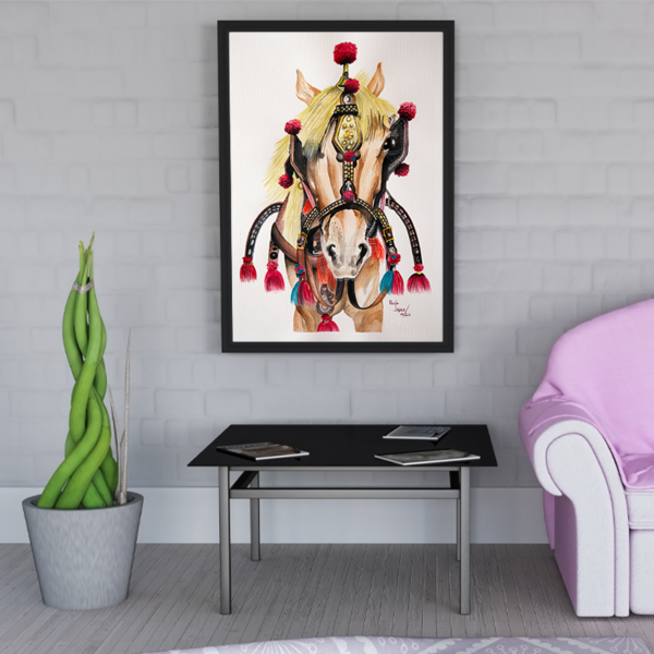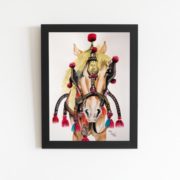 Este cuadro, es el retrato de un caballo que captó mi atención en un viaje que hice a Bali. Los utilizan para llevar carruajes, como medio de transporte, aunque no estoy de acuerdo con esto, amé como se veía con los colores (estaba en perfecto estado) y adornos que lo rodeaban.