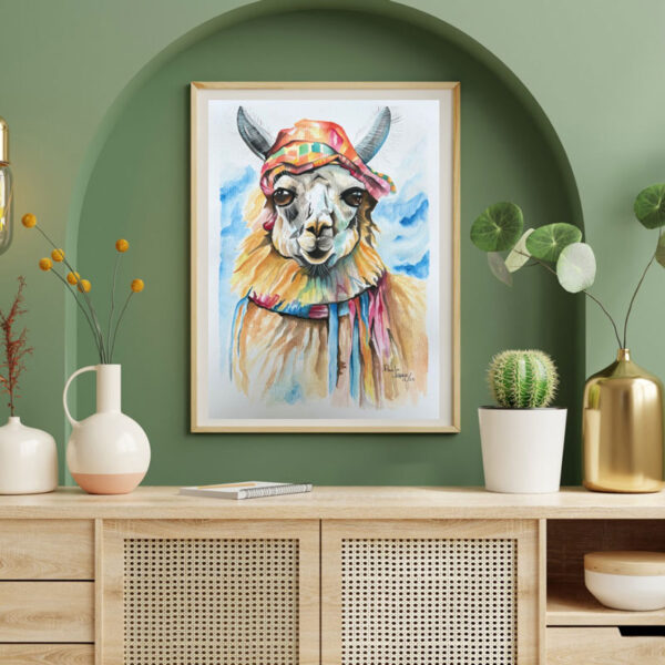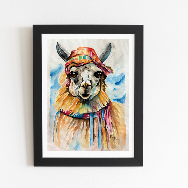 Esta obra retrata una llama, a la que decidí añadirle una bufanda de colores en el cuello y cabeza, dándole un toque de identidad de la cultura ecuatoriana (por el tejido).