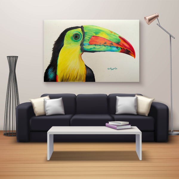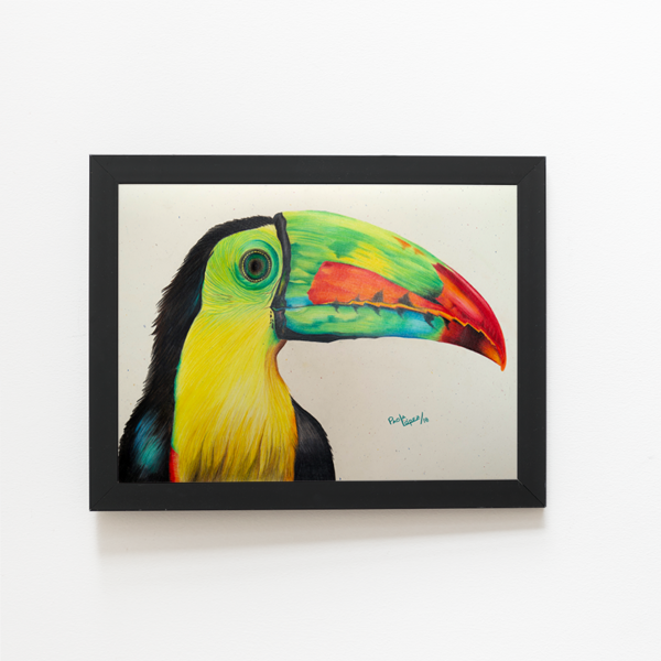La pintura muestra a un tucán de la Amazonía ecuatoriana. que está observando todo.